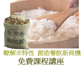 為促進國產米產業發展,協助國內餐飲業者研發拓展米食料理市場,以利帶動國人消費米食的興趣,特辦理『瞭解米特性 創造餐飲新商機』講座,建立正確米食知識與米食製作技巧,課程藉由瞭解米的種類特性及營養價值切入,了解不同品種的米如何運用於料理上,提升餐飲業主人員對台灣米的認識。